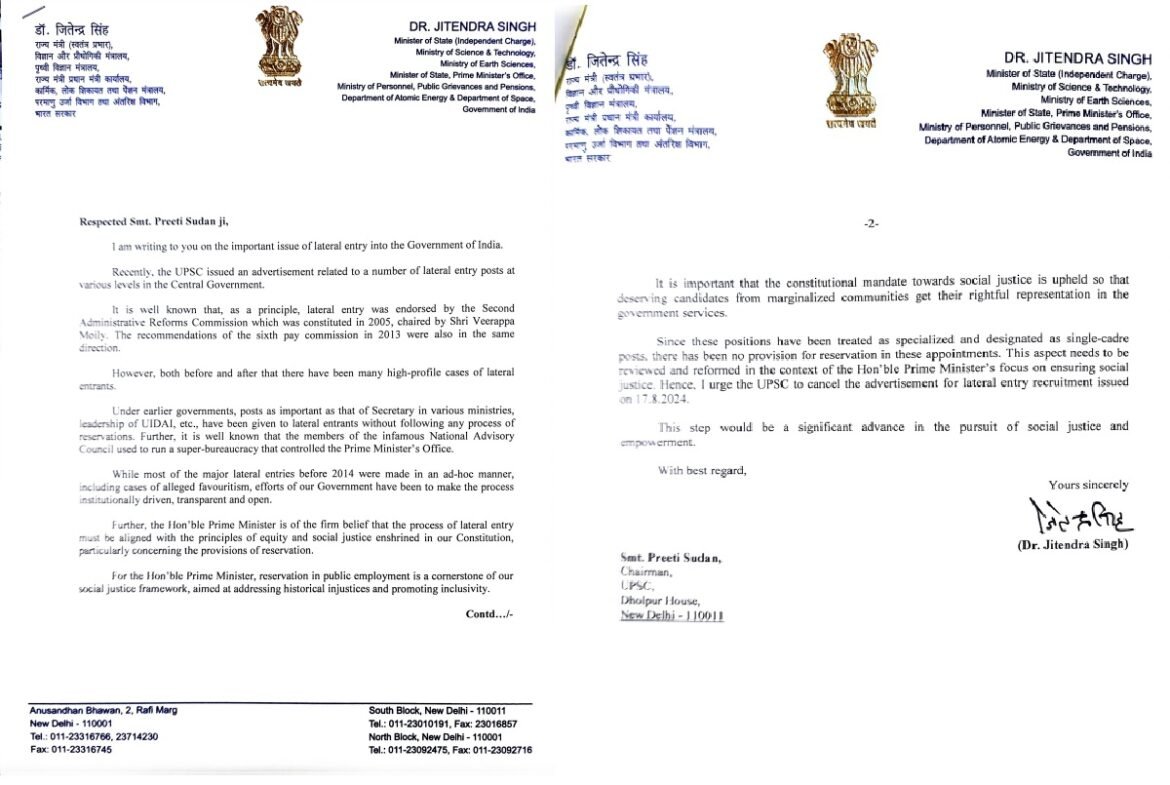 5. ”प्रधानमंत्री का यह पुरजोर तरीके से मानना है कि विशेषकर आरक्षण के प्रावधानों के परिप्रेक्ष्य में संविधान में उल्लेखित समानता और सामाजिक न्याय के सिद्धांतों के अनुरूप लेटरली एंट्री की प्रक्रिया को सुसंगत बनाया जाए।”