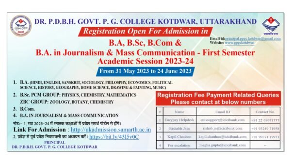 कोटद्वार । डॉक्टर पितांबर दत्त हिमालयान राजकीय स्नातकोत्तर महाविद्यालय में स्नातक प्रथम वर्ष की 1800 सीटों के लिए समर्थ पोर्टल पर प्रवेश आवेदन की प्रक्रिया 31 मई से प्रारंभ हो गई है। इस आशय की जानकारी कॉलेज की प्राचार्य प्रोफेसर जानकी पवांर ने दी। प्राचार्य ने बताया कि शैक्षणिक सत्र 2023-24 के लिए महाविद्यालय में प्रवेश प्रक्रिया गतिमान है। वर्तमान में महाविद्यालय में 4 संकाय अस्तित्व में है जिसमें कला संकाय के अंतर्गत 12 (संस्कृत, हिंदी, अंग्रेजी, समाजशास्त्र , दर्शनशास्त्र, अर्थशास्त्र, राजनीति शास्त्र, इतिहास , गृह विज्ञान, भूगोल, चित्रकला तथा संगीत) विषयों में कुल 800 सीटें, विज्ञान संकाय के अंतर्गत 2 ग्रुपों बायो वर्ग तथा गणित वर्ग में कुल 640 सीटें, वाणिज्य संकाय के अंतर्गत स्नातक स्तर पर 320 सीटें तथा बीए जनलिस्म एंड मास कम्युनिकेशन में पृथक से 40 सीटें स्वीकृत है और प्रवेश के लिए उपलब्ध है। प्राचार्य ने जानकारी दी कि पंजीकरण 31मई 2023 से प्रारंभ हो गई है तथा पंजीकरण की अंतिम तिथि 24 जून 2023 है । उन्होंने प्रवेश के इच्छुक छात्र, छात्राओं को समर्थ पोर्टल के link https://ukadmission.samarth.ac.in पर जाकर रजिस्ट्रेशन एवं प्रवेश आवेदन प्रक्रिया को पूरा करने को कहा ।