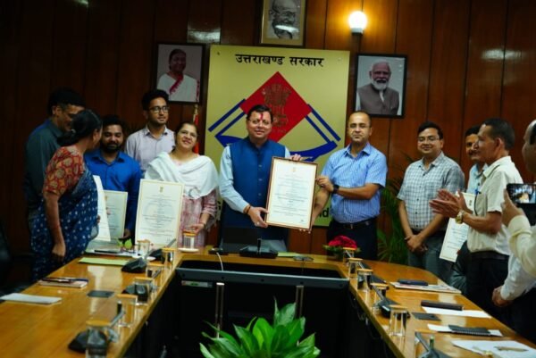 देहरादून : मुख्यमंत्री पुष्कर सिंह धामी से सोमवार को सचिवालय में सचिव सूचना प्रौद्योगिकी शैलेश बगोली एवं निदेशक आई.टी.डी.ए. नीतिका खण्डेलवाल ने भेंट की। उन्होंने राज्य की सूचना प्रौद्योगिकी विकास एजेन्सी (आई.टी.डी.ए.) को इंदौर में आयोजित 26वीं ई-गवर्नेंस कॉन्फ्रेंस में अपुणी सरकार पोर्टल को नेशनल ई-गवर्नेंस अवार्ड 2023 के साथ प्रदान किये गये रजत पदक एवं ट्रॉफी मुख्यमंत्री को भेंट की। इस अवॉर्ड के अंतर्गत ट्रॉफी एवं 5लाख का पुरुस्कार भी शामिल है।