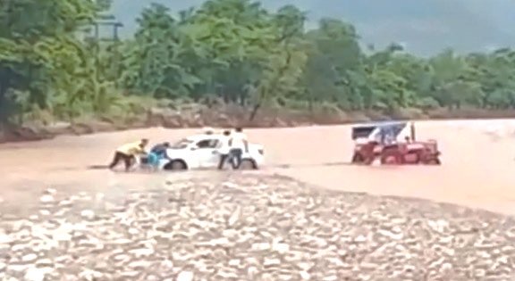 हरिद्वार। देर रात से हो रही भारी बारिश के चलते चीला रेंज में बह रहा घासीराम स्रोत उफान पर आ गया। इस दौरान यहां से गुजर रही एक कार पानी के तेज बहाव के बीच फंस गयी। लाख कोशिश के बाद कार में सवार लोग किसी तरह से अपनी जान बचाने में सफल रहे, किन्तु उनकी कारं पानी के तेज बहाव में बह गयी। कार में सवार चार लोग चीला पावर प्रोजेक्ट कॉलोनी के रहने वाले बताए जा रहे हैं। शुक्रवार की सुबह पार्क कर्मियों की टीम ने पानी में बही कार को ट्रैक्टर की मदद से बाहर निकाला। बताते हैं कि घासीराम स्रोत में उफान पर आने के कारण मौके पर स्टाफ द्वारा रोके जाने के बावजूद भी ये लोग नदी पार करने लगे, जिससे यह हादसा हुआ। मौके पर ही इन्हें रेस्क्यू किया गया। जिससे इनकी जान बच सकी।
