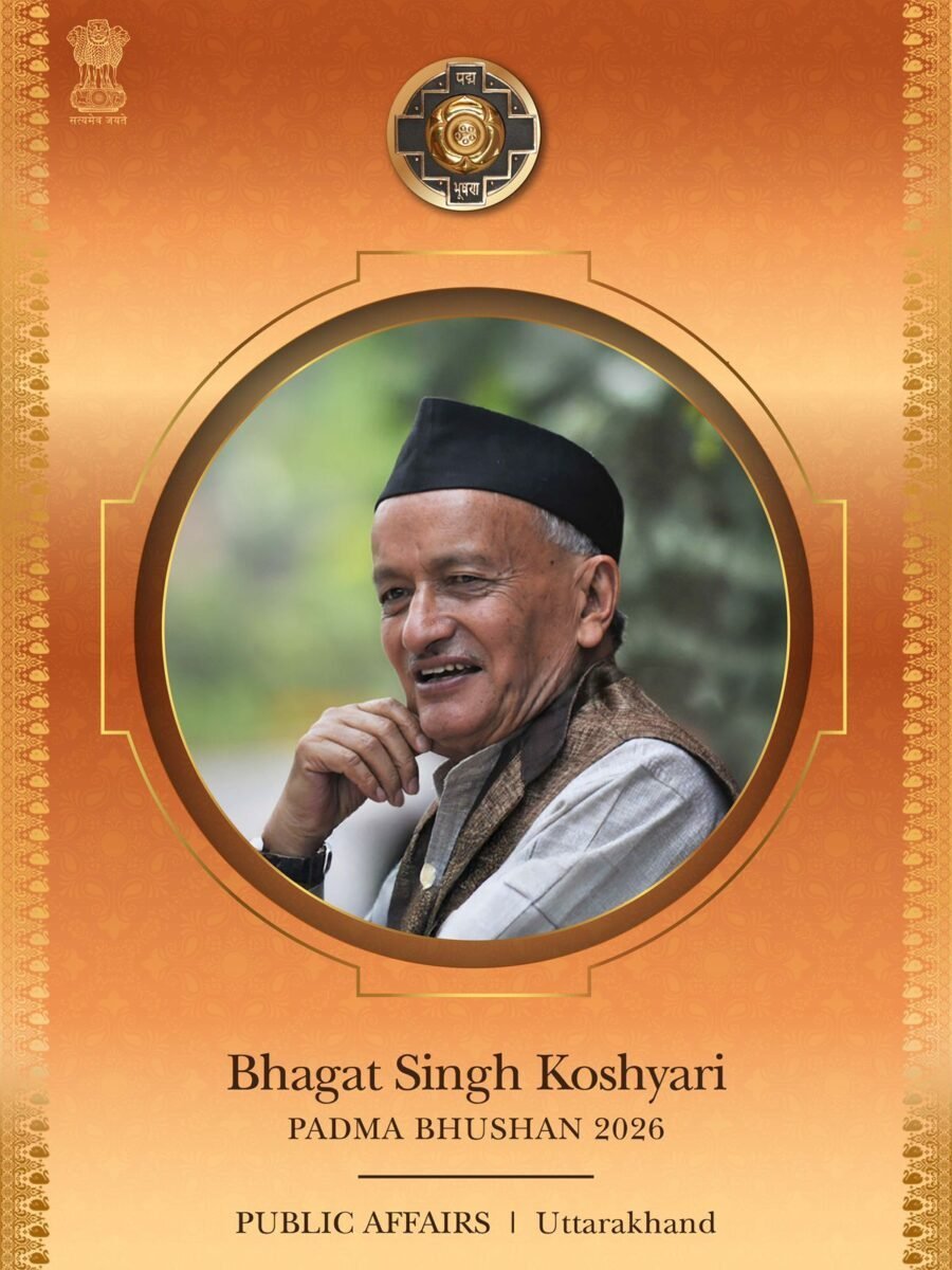 देहरादून : मुख्यमंत्री पुष्कर सिंह धामी ने उत्तराखंड के पूर्व मुख्यमंत्री व महाराष्ट्र के पूर्व राज्यपाल भगत सिंह कोश्यारी को पद्म भूषण सम्मान से सम्मानित किए जाने की घोषणा पर हर्ष व्यक्त किया है। मुख्यमंत्री ने कहा कि भगत सिंह कोश्यारी को पद्म भूषण सम्मान प्रदान किए जाने की घोषणा समस्त उत्तराखंडवासियों के लिए अत्यंत गौरव और प्रसन्नता का विषय है। यह सम्मान उनके संपूर्ण सार्वजनिक जीवन, राष्ट्रसेवा और समाजहित के प्रति समर्पण का यथोचित सम्मान है।