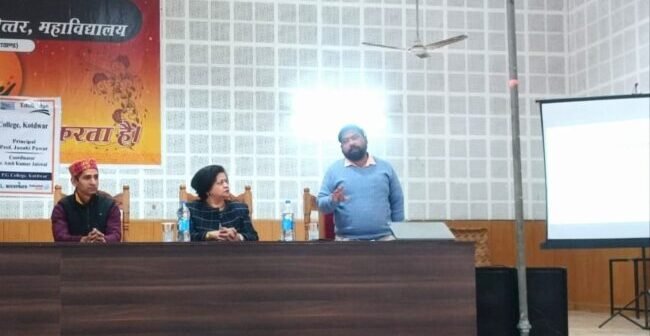 देहरादून : डाॅ. पी. द. ब. हिमालयन राजकीय स्नातकोत्तर महाविद्यालय कोटद्वार के जीव विज्ञान विभाग की प्राध्यापक डॉ. सुनीता नेगी द्वारा राजकीय शिक्षा नीति 2022 के अंतर्गत विज्ञान स्नातक प्रथम सेमेस्टर के विद्यार्थियों हेतु सह पाठ्यक्रम प्रश्न पत्र के व्यवहारिक संप्रेषण कौशल विषय पर एक व्याख्यान संयोजन किया गया। व्याख्यान में Keynote वक्ता डॉ. सोमेश ढौंडियाल ने संप्रेषण प्रक्रिया के महत्व एवं विविध पहलुओं पर पावर प्वाइंट प्रजेंटेशन द्वारा प्रकाश डाला गया। महाविद्यालय की प्राचार्य प्रोफ़ेसर जानकी पवॉर ने सम्प्रेषण की उपयोगिता और NEP 2020 के सहपाठ्यक्रम में इसकी संबद्धता पर प्रकाश डाला और विद्यार्थियों को शुभकामना दी।कार्यक्रम का संचालन डॉक्टर सुनीता नेगी द्वारा किया गया। डॉ. मुकेश रावत एवं डॉ. मोहन कुकरेती द्वारा पावर पॉइंट प्रेजेंटेशन का संचालन किया गया एवं डॉ. सुरभि मिश्रा ने धन्यवाद ज्ञापित किया । इस अवसर पर डॉ. जुनीश कुमार, डॉक्टर रंजना, डॉ. पूनम गैरोला, डॉ. सुमन कुकरेती, डॉ. सुनीता गुसाईं दानू, डॉ. प्रियम अग्रवाल, डॉ. अमित कुमार गौड़ एवं डॉ .सूर्य मोहन गौड उपस्थित रहे।