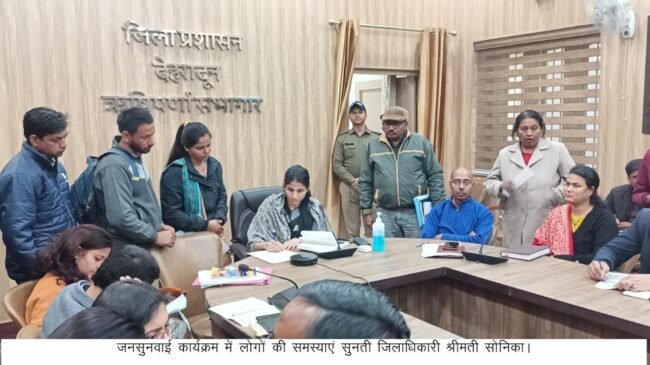 देहरादून : जिलाधिकारी सोनिका की अध्यक्षता में आज ऋषिपर्णा सभागार में जनसुनवाई का आयोजन किया गया। जनसुनवाई में 107 शिकायतें प्राप्त हुई। जनसुनवाई में राजस्व, नगर निगम, एमडीडीए, सिंचाई, विद्युत, समाज कल्याण, लोनिवि, पीएमजीएसवाई आदि विभागों से संबंधित प्राप्त हुई। जिनमें अधिकतर शिकायतें भूमि कब्जा, अतिक्रमण, अवैध निर्माण से संबंधित प्राप्त हुई इसके अलावा आर्थिक सहायता, चकबंदी, वाहन के बीजकों को शस्त्र लाईसेंस, विद्युत कनेक्शन, विधवा पेंशन, साइबर ठगी आदि शिकायतें प्राप्त हुई। जिलाधिकारी ने सभी अधिकारियों को निर्देशित किया कि जनसुनवाई में उनसे संबंधित जो शिकायतें प्राप्त हो रही है उनका त्वरित निस्तारण के साथ ही अपने स्तर पर समीक्षा करने के भी निर्देश दिए।