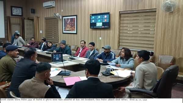 देहरादून : आगामी लोकसभा सामान्य निर्वाचन-2024 की तैयारियों के सम्बन्ध में नोडल अधिकारियों के साथ जिलाधिकारी/जिला निर्वाचन अधिकारी सोनिका की अध्यक्षता में ऋषिपर्णा सभागार कलेक्ट्रेट में बैठक आयोजित की गई। जिलाधिकारी/जिला निर्वाचन अधिकारी ने निर्देशित किया कि मतदान में मतदाताओं की अधिक से अधिक भागीदारी के लिए स्वीप गतिविधि आयोजित करते हुए मतदान के प्रति जागरूक किया जाए तथा उप जिलाधिकारी अपने-अपने क्षेत्रों में स्वीप गतिविधि की मॉनिटिरिंग भी करें।