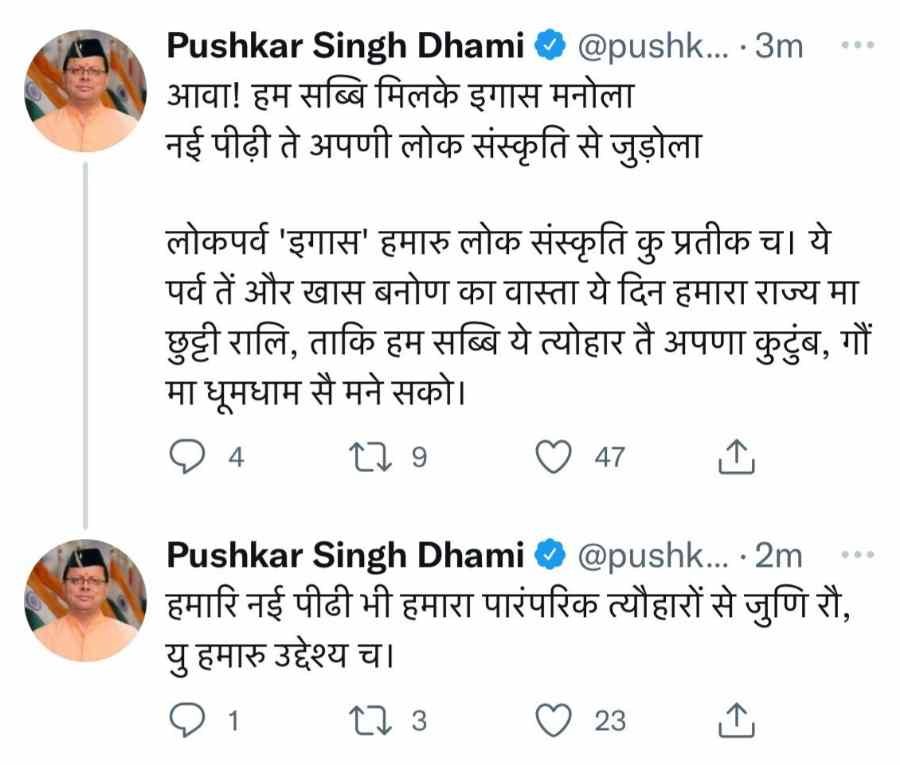 ट्वीट द्वारा यह जानकारी देते हुए मुख्यमंत्री ने कहा कि “आवा! हम सब्बि मिलके इगास मनोला नई पीढ़ी ते अपणी लोक संस्कृति से जुड़ोला। लोकपर्व ‘इगास’ हमारु लोक संस्कृति कु प्रतीक च। ये पर्व तें और खास बनोण का वास्ता ये दिन हमारा राज्य मा छुट्टी रालि, ताकि हम सब्बि ये त्योहार तै अपणा कुटुंब, गौं मा धूमधाम से मने सको । हमारि नई पीढी भी हमारा पारंपरिक त्यौहारों से जुणि रौ, यु हमारु उद्देश्य च।”