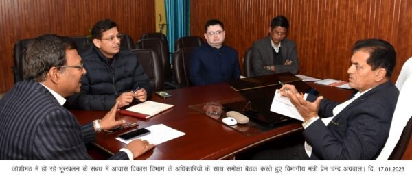 आवास मंत्री डॉ. प्रेमचंद अग्रवाल ने अपर मुख्य सचिव आनंद वर्धन को तत्काल कार्यदाई संस्था द्वारा कार्यवाही करने को कहा। उन्होंने कहा कि जोशीमठ में भी जाकर समस्त अधिकारी कार्य योजना शीघ्र लागू करें। आवास मंत्री डॉ. प्रेमचंद अग्रवाल ने कहा कि पूरे प्रदेश में 63 जगहों पर मास्टर प्लान बनाया जाना है इनमें 43 पहाड़ी, जबकि 20 मैदानी क्षेत्र शामिल हैं। उन्होंने बताया कि हर जिले का मास्टर प्लान अलग-अलग कंपनी तैयार करेगी। इस मौके पर मंत्री ने चमोली में मास्टर प्लान तैयार करने वाली कंपनी आरईपीएल को शीघ्र मास्टर प्लान बनाने के निर्देश दिए। इस मौके पर अपर मुख्य सचिव आनंद वर्धन, अपर आयुक्त आवास पीसी दुमका, चीफ टाउन प्लानर एसएम श्रीवास्तव, संयुक्त सचिव आवास राजेंद्र सिंह पतियाल उपस्थित रहे।