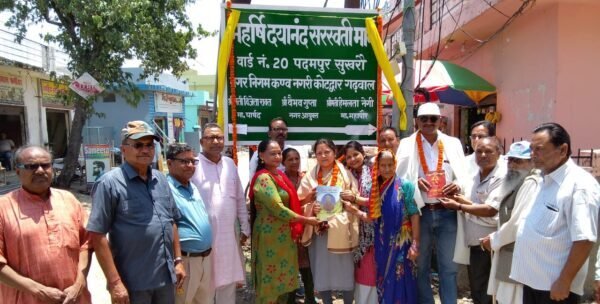 जिसके लिए आर्य गिरधारी लाल महर्षि दयानंद ट्रस्ट के अध्यक्ष सुरेन्द्र लाल आर्य सर्वोदयी पुरूष ने महापौर व पार्षदों का आभार व्यक्त किया और कहा कि महर्षि दयानंद सरस्वती की 200वीं जयंती पर उनके नाम पर मार्ग का नाम रखकर नगर निगम कोटद्वार ने उनको सच्ची श्रद्धांजलि अर्पित की है । विश्वम्भर दयाल मुनि विश्वकर्मा ट्रस्ट की अध्यक्षा लक्ष्मी देवी ने कहा कि महिलाओं के उत्थान में महर्षि दयानंद सरस्वती का विशेष योगदान रहा है । मुख्य अतिथि सुखपाल शाह ने कहा कि महापुरुषों का सम्मान होना ही चाहिये, स्वामी दयानंद सरस्वती 19 वीं शताब्दी के महानायक थे,उन्होंने समाज मे व्याप्त अंधविश्वास, पाखंड, रूढिवादिता के खिलाफ संघर्ष किया व 1857 में स्वतंत्रता के लिए आंदोलन की भूमि तैयार की । आर्य गिरधारीलाल महर्षि दयानंद ट्रस्ट के तत्वावधान में आयोजित सभा की अध्यक्षता प्रोफेसर नन्दकिशोर ढोडियाल ‘अरुण’ व संचालन शूरबीर खेतवाल ने किया । सभा को ओमप्रकाश आर्य, चक्रधर शर्मा ‘कमलेश’, महेश कौशिक, कुसुमलता, सुदीप बौंठियाल, ओमप्रकाश कोटला, भरत सिंह, डॉ पीसी जोशी, अजय नेगी, कुंती देवी, सुरेशानंद मंझेडा, बलबीर सिंह रुमेलाआदि ने सम्बोधित किया ।