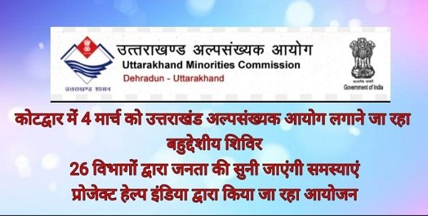कोटद्वार : प्रोजेक्ट हेल्प इंडिया कोटद्वार के अनुरोध पर उत्तराखंड सरकार, अल्पसंख्यक आयोग द्वारा 4 मार्च को कोटद्वार में बहुद्देशीय शिविर का आयोजन किया जा रहा है। इस संबंध में अल्पसंख्यक आयोग के सचिव जेएस रावत द्वारा बीते 23 फरवरी को जिलाधिकारी पौड़ी गढ़वाल को पत्र भी भेजा जा चुका है की प्रोजेक्ट हेल्प इंडिया कोटद्वार के निदेशक अमित सेमुअल द्वारा 4 मार्च को मेथोडिस्ट चर्च कंपाउंड, निकट मीट मार्केट कोटद्वार में प्रातः 11 बजे बहुद्देशीय शिविर का आयोजन किया जाएगा। जिसमे उत्तराखंड अल्प संख्यक आयोग के अध्यक्ष डॉ आरके जैन मुख्य अतिथि रहेंगे।