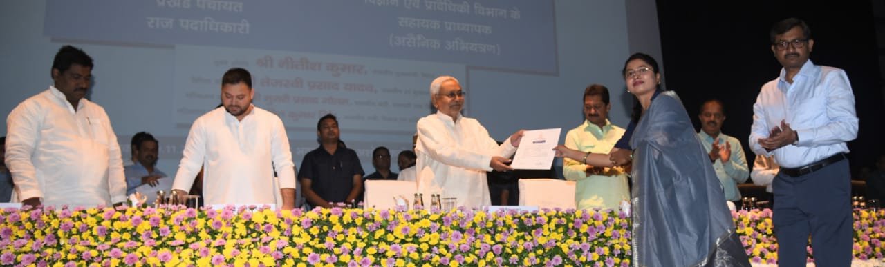 पटना : मुख्यमंत्री नीतीश कुमार आज सम्राट अशोक कन्वेंशन केंद्र स्थित ज्ञान भवन में आयोजित विज्ञान एवं प्रावैधिकी विभाग के नवचयनित सहायक प्राध्यापक (असैनिक) एवं पंचायती राज विभाग के प्रखंड पंचायत राज पदाधिकारियों के नियुक्ति पत्र वितरण कार्यक्रम में शामिल हुए। इस अवसर पर मुख्यमंत्री ने सांकेतिक रूप से विज्ञान एवं प्रावैधिकी विभाग के 5 नवचयनित सहायक प्राध्यापक (असैनिक) एवं पंचायती राज विभाग के 5 प्रखंड पंचायत राज पदाधिकारियों को नियुक्ति पत्र सौंपा। इस अवसर पर आयोजित कार्यक्रम को संबोधित करते हुए मुख्यमंत्री ने कहा कि ये खुशी की बात है कि आज विज्ञान एवं प्रावैधिकी विभाग के 281 नवचयनित सहायक प्राध्यापक (असैनिक) तथा पंचायती राज विभाग के 144 प्रखण्ड पंचायत राज पदाधिकारियों को नियुक्ति पत्र दिया गया है। कुल 425 पदों पर नियुक्ति पत्र वितरण किया गया। सभी लोगों ने विस्तार से सब कुछ बता दिया है। आज उप मुख्यमंत्री श्री तेजस्वी प्रसाद यादव जी का जन्मदिन भी है, मैं उनके जन्मदिन पर उन्हें बधाई और शुभकामनायें देता हूँ।