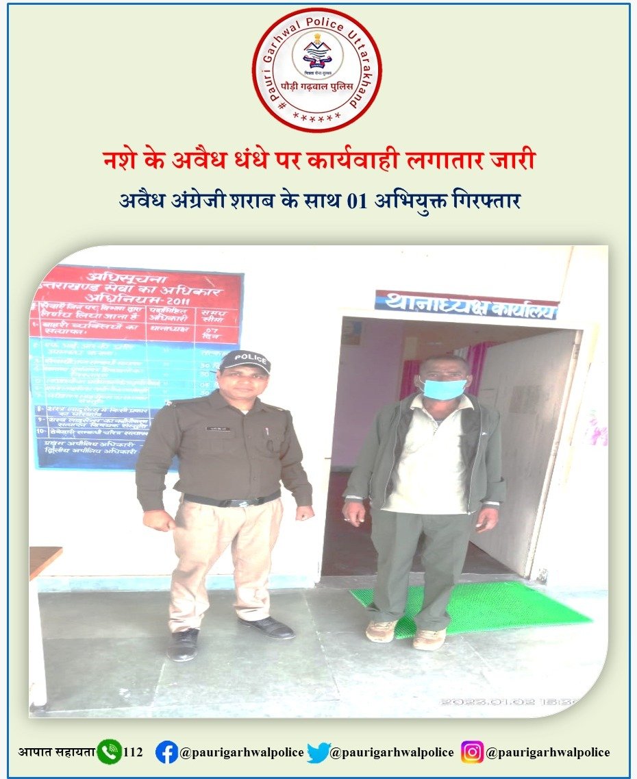 रिखणीखाल । पौड़ी जनपद की रिखणीखाल पुलिस ने थाना क्षेत्रान्तर्गत चैकिंग के दौरान दीवान सिंह पुत्र स्व0 मनोहर सिंह, निवासी- ग्राम कोला गाड़, पट्टी तल्ला बदलपुर, तहसील लैन्सडाउन, जनपद पौड़ी गढ़वाल को 52 पव्वे अवैध अंग्रेजी शराब के साथ गिरफ्तार किया । जिस सम्बन्ध में अभियुक्त के विरूद्ध थाना रिखणीखाल में आबकारी अधिनियम के तहत अभियोग पंजीकृत किया गया।