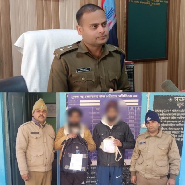 उत्तरकाशी (कीर्तिनिधि सजवाण): पुलिस अधीक्षक उत्तरकाशी अर्पण यदुवंशी द्वारा Drugs Free Devbhoomi -2025 मिशन को बखूबी अंजाम तक पहुंचा रहे हैं, जनपद में नशे को जड़ से खत्म करने के नशामुक्त उत्तरकाशी का संकल्प लेकर वह दिन-प्रतिदिन नशे के सौदागरों को सलाकों के पीछे पहुंचा रहे हैं, युवा पीढ़ी को नशे के जंजाल में धकेलकर उनके भविष्य से खिलवाड करने वाले नशे के सौदागरों को उनके द्वारा पूर्व से ही साफ संदेश देकर कठोर कार्रवाई की चेतवानी दी गई है। उनके द्वारा अधिनस्थ पुलिस अधिकारी/कर्मचारियों को नशा तस्करों पर सतर्क दृष्टि रखते हुये उन्हें चिन्हित कर सख्त कार्रवाई के निर्देश दिये गये हैं, लगातार चौथे दिन चरस तस्करों के प्रति कार्रवाई करते हुये प्रशान्त कुमार क्षेत्राधिकारी मोरी के निकट पर्यवेक्षण एवं थानाध्यक्ष मोहन कठैत के नेतृत्व में गत देर रात्रि को संदिग्ध वाहन/व्यक्तियों की रुठीन चैकिंग करते हुये जे0पी0 पुल के पास से एक अल्टो वाहन संख्या PB65AK-5707 जिसमें सत्येंद्र राणा पुत्रसमय सिंह राणा निवासी जोधपुर पोस्ट खोलाण तहसील निवासी जिला मोहाली पंजाब उम्र 28 वर्ष एवं एवं प्रशांत नेगी पुत्र दिनेश नेगी निवासी 108 टीएचडीसी कॉलोनी अजबपुर कलां थाना नेहरू कॉलोनी देहरादून उम्र 22 वर्ष व्यक्ति सवार थे ।उनको रोककर चैक किया गया तो उनके पास से कुल 802.5 ग्राम चरस बरामद की गई। जिसकी अंतरराष्ट्रीय बाजार में कीमत लगभग ₹300000 है।