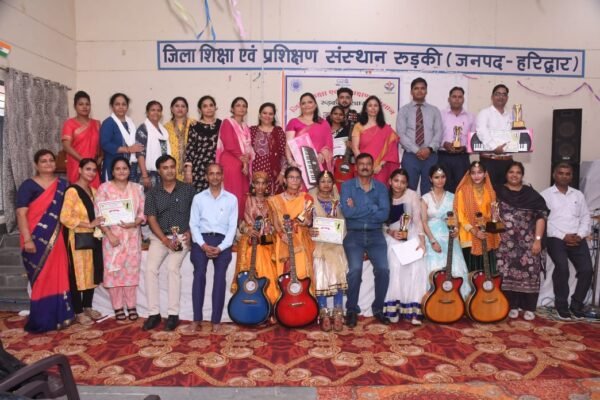 रूडकी : जिला शिक्षा एवं प्रशिक्षण संस्थान रुड़की में संगीत प्रतिभा सम्मान समारोह 2023 का आयोजन डायट प्राचार्य केके गुप्ता के निर्देशानुसार आयोजित किया गया विकास खंड पर प्रतिभाग करने वाले विद्यार्थियों एवं शिक्षकों को चयन के उपरांत सम्मान समारोह में प्रतिभाग करने का अवसर प्राप्त हुआ प्रतिभा सम्मान समारोह में शिक्षकों एवं विद्यार्थियों ने गायन एवं नृत्य की विधाओं में प्रतिभा किया।शिक्षकों की विधाओं में आर्य कन्या इंटर कॉलेज से कंचन मल्होत्रा एवं केवल कन्या पाठशाला मंगलौर से प्रिया प्रथम रही। विद्यार्थियों की विधाओं में आर्य कन्या इंटर कॉलेज की विद्यार्थी मंतशा एवं एसएसडीपीसी की छात्रा बुशरा अंसारी प्रथम रही।  यह शिक्षक एवं विद्यार्थी राज्य स्तर पर होने वाले संगीत प्रतिभा सम्मान समारोह में प्रतिभा करने के लिए देहरादून जाएंगे।