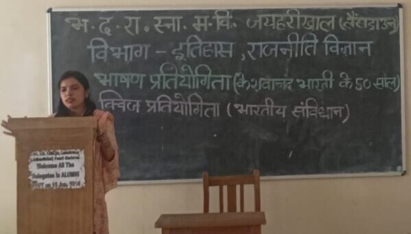 हिंदी विभाग के विभागाध्यक्ष डॉ उमेश ध्यानी ने सविधान के महत्व के संदर्भ में कहा कि संविधान द्वारा मूल रूप से सात मूल अधिकार प्रदान किए गए थे जिसमें समानता का अधिकार, स्वतंत्रता का अधिकार, शोषण के विरुद्ध अधिकार, धर्म, संस्कृति एवं शिक्षा की स्वतंत्रता का अधिकार, संपत्ति का अधिकार तथा संवैधानिक उपचारों का अधिकार है । कार्यक्रम का संचालन हिंदी विभाग की सहायक प्राध्यापक डॉ नीना ने किया । आयोजित भाषण प्रतियोगिता में सिमरन बानो प्रथम, द्वितीय स्थान पर तनीषा, तृतीय स्थान पर मिस्बाह रहे । सामान्य ज्ञान प्रतियोगिता में सिमरन बानो, निकिता, मानसी, दीपांजलि के ग्रुप ने प्रथम स्थान प्राप्त किया । इस अवसर पर महाविद्यालय के समस्त प्राध्यापक एवं कर्मचारीगण उपस्थित रहे।