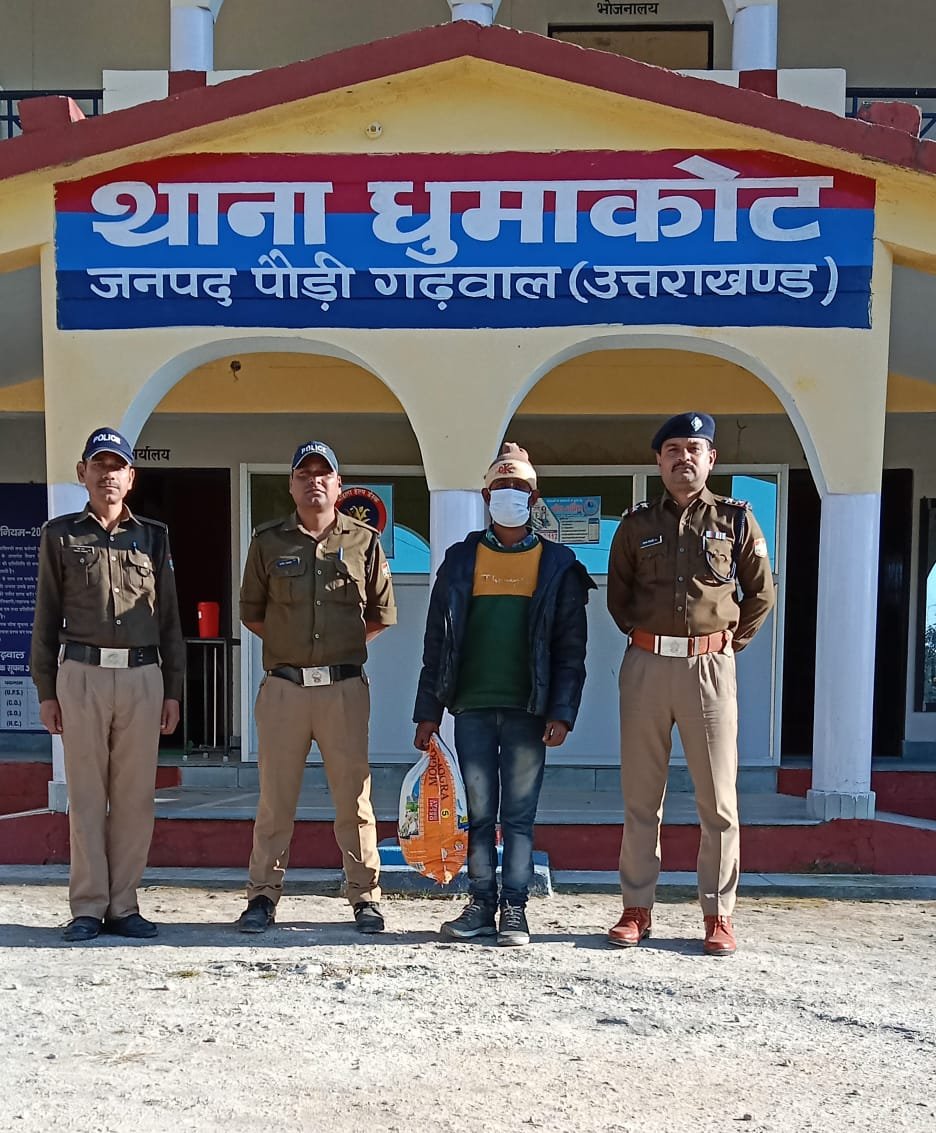 जिसके क्रम में अपर पुलिस अधीक्षक शेखर चन्द्र सुयाल के निर्देशन, क्षेत्राधिकारी कोटद्वार गणेश लाल कोहली, क्षेत्राधिकारी ऑपरेशन विभव सैनी के पर्यवेक्षण, थानाध्यक्ष दीपक तिवारी के नेतृत्व में पुलिस टीम द्वारा थाना क्षेत्रान्तर्गत चैकिंग के दौरान आज 12 नवम्बर 2022 को अभियुक्त सोनू कुमार को लिस्टियाखेत धुमाकोट के पास से 04 किलोग्राम अवैध गांजे के साथ गिरफ्तार किया गया। अभियुक्त ने पूछताछ में बताया कि वह थलीसैण क्षेत्र से परमानन्द उर्फ मिस्त्री से गांजा खरीदकर मैदानी क्षेत्रों में ऊँचे दामों पर बेचता था। जिस सम्बन्ध में अभियुक्तों के विरूद्ध थाना धुमाकोट पर NDPS ACT के तहत अभियोग पंजीकृत किया गया। अभियुक्तों के अन्य आपराधिक इतिहास की जानकारी की जा रही है। पौड़ी गढ़वाल पुलिस द्वारा युवाओं में बढ़ते नशे की प्रवृत्ति की रोकथाम हेतु नशे के कारोबार में संलिप्त अभियुक्तों के विरुद्ध निरोधात्मक कार्यवाही लगातार जारी है। नशे की प्रवृत्ति का रोकथाम हेतु समय-समय पर जागरूक कार्यक्रम व कांउन्सलिंग की जा रही है।