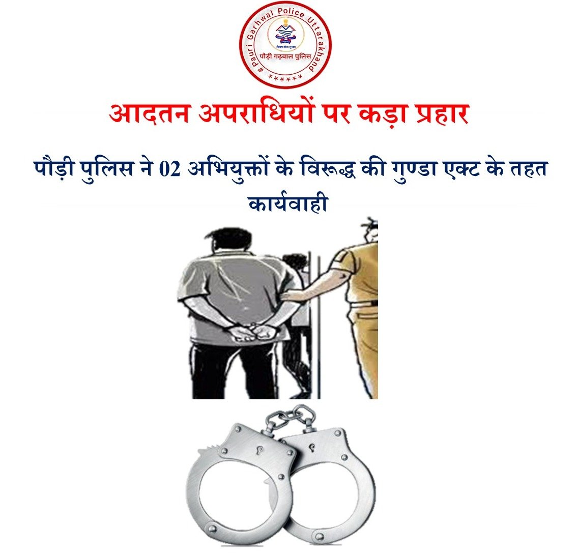 कोटद्वार/पौड़ी : वरिष्ठ पुलिस अधीक्षक जनपद पौड़ी गढ़वाल श्वेता चौबे ने जनपद में आपराधिक गतिविधियों की रोकथाम, आदतन अपराधियों की निगरानी करने, भविष्य में आपराधिक गतिविधियों पर अंकुश लगाए जाने तथा अवैध गतिविधियों में संलिप्त आदतन अपराधियों के विरुद्ध कड़ी कार्यवाही करने हेतु समस्त थाना प्रभारियों को निर्देशित किया गया है। जिसके क्रम में अपर पुलिस अधीक्षक कोटद्वार शेखर चन्द्र सुयाल के निर्देशन, क्षेत्राधिकारी कोटद्वार गणेश लाल कोहली के पर्यवेक्षण, प्रभारी निरीक्षक विजय सिंह के नेतृत्व में कोतवाली कोटद्वार पुलिस ने अभियुक्त (I) नदीम उर्फ पौधा पुत्र नसीम, निवासी लकड़ी पड़ाव कोटद्वार, जनपद पौड़ी गढ़वाल, (II) चांद उर्फ फिरोज पुत्र जुल्फकार, निवासी आमपड़ाव कोटद्वार, जनपद पौड़ी गढ़वाल के विरूद्ध गुंडा अधिनियम के अन्तर्गत वैधानिक कार्यावाही की गयी। जनपद में ऐसे आदतन अपराधी जो कई अपराधों में संलिप्त हैं, उनके विरूद्ध गुंडा एक्ट के अन्तर्गत वैधानिक कार्यवाही लगातार जारी है।