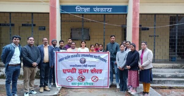 लैंसडौन । भक्त दर्शन राजकीय स्नातकोत्तर महाविद्यालय जयहरीखाल के एंटी ड्रग सेल के तत्वधान में वाणिज्य संकाय और शिक्षा संकाय के छात्र छात्राओं ने संयुक्त रूप से नशा मुक्ति रैली का आयोजन किया । भक्त दर्शन राजकीय स्नातकोत्तर महाविद्यालय जयहरीखाल के एंटी ड्रग सेल के प्रभारी डॉ. वीके सैनी, बीएड संकाय के विभागाध्यक्ष डॉ. आरके सिंह, प्राध्यापक डॉ. अंजलि, वाणिज्य संकाय के सहायक समन्वयक डॉ. वरुण कुमार, कला संकाय से सहायक समन्वयक डॉ. वन्दना ध्यानी ने सोमवार को छात्र छात्राओं को नशा मुक्ति की शपथ दिलाई गई । जिसमें उन्हें भविष्य में किसी प्रकार का नशा न लेने की शपथ दिलाई गई । अंत में महाविद्यालय की प्राचार्य डॉ. प्रोफेसर लवनी आर राजवंशी ने समस्त छात्रों और प्राध्यापकों को संबोधित करते हुए कहा कि नशा नई पीढ़ी के लिए एक अभिशाप है आप सभी महाविद्यालय में ही नहीं अपने आसपास, अपने परिवार, गाँव, समाज में सभी को इस के संबंध में जागरूक करेंगे ।