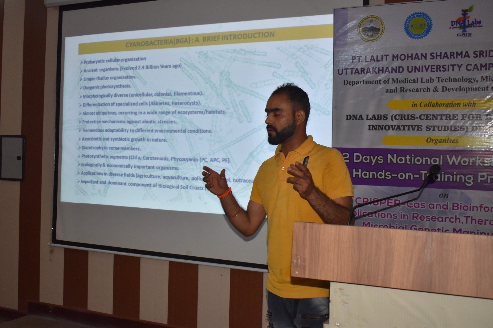अंत में डीएनए लैब के प्रमुख डॉ नरोत्तम शर्मा ने इन दो दिवसीय कार्यशाला में प्रतिभागियों को दिए गए प्रशिक्षण के बारे में विस्तार पूर्वक अवगत कराया जिसमें उन्होंने कहा कि CRISPR-Cas जीन संपादन तकनीक है जो कि जीवों के जीनोम में विशेष परिवर्तन करने की अनुमति देती, यह तकनीक जीव विज्ञान और चिकित्सा में क्रांति लाने की क्षमता रखती है। CRISPR-Cas का उपयोग जेनेटिक विकारों के इलाज के लिए किया जा सकता है, जैसे कैंसर कोशिकाओं को नष्ट करने के लिए फसलों की उत्पादकता और रोग प्रतिरोधक क्षमता में सुधार करने के लिए किया जा सकता है। इसी तकनीकी को PCR से माध्यम से जाना जा सकता है I