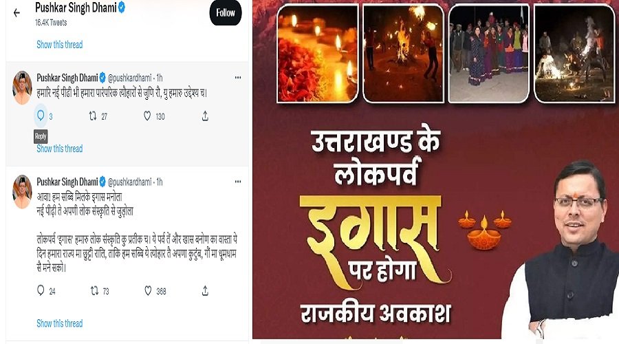 ट्वीट द्वारा यह जानकारी देते हुए मुख्यमंत्री ने कहा कि “आवा! हम सब्बि मिलके इगास मनोला नई पीढ़ी ते अपणी लोक संस्कृति से जुड़ोला। लोकपर्व ‘इगास’ हमारु लोक संस्कृति कु प्रतीक च। ये पर्व तें और खास बनोण का वास्ता ये दिन हमारा राज्य मा छुट्टी रालि, ताकि हम सब्बि ये त्योहार तै अपणा कुटुंब, गौं मा धूमधाम से मने सको । हमारि नई पीढी भी हमारा पारंपरिक त्यौहारों से जुणि रौ, यु हमारु उद्देश्य च।”