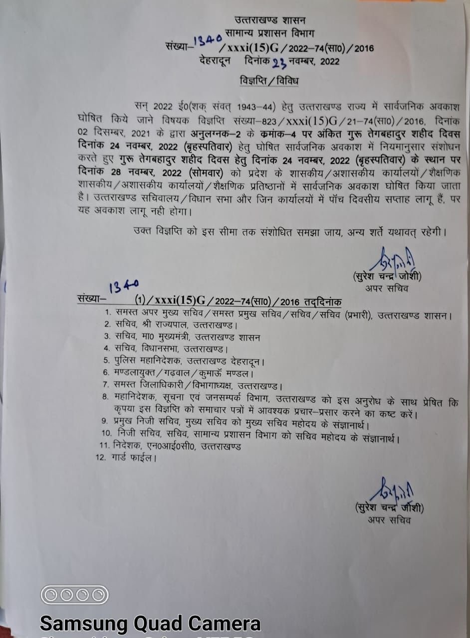 देहरादून : प्रदेश सरकार ने कल 24 नवंबर के अवकाश को लेकर बदलाव किया है। इस बाबत सामान्य प्रशासन विभाग के अपर सचिव सुरेश चंद्र जोशी ने आदेश जारी कर दिया है। उत्तराखंड में अब गुरू तेग बहादुर शहीद दिवस का अवकाश 24 नवम्बर के स्थान पर 28 नवम्बर को रहेगा। उत्तराखंड में इससे पहले गुरु तेग बहादुर शहीदी दिवस के अवसर पर 24 नवंबर को अवकाश घोषित किया गया था, लेकिन अब इसमें संशोधन किया गया है। जारी आदेश के अनुसार, 24 नवम्बर के स्थान पर अब 28 नवम्बर, 2022 (सोमवार) को उत्तराखंड के शासकीय/अशासकीय कार्यालयों/शैक्षणिक शासकीय/अशासकीय कार्यालयों/शैक्षणिक प्रतिष्ठानों में सार्वजनिक अवकाश घोषित किया गया है। हालांकि, उत्तराखण्ड सचिवालय/विधान सभा और जिन कार्यालयों में पाँच दिवसीय सप्ताह लागू है, उन कार्यालयों में यह अवकाश लागू नही होगा।